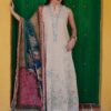 The printed dupatta introduces a dreamy wash of florals in refreshing pastel hues, creating a soft contrast against the earthy base. Paired with coordinated trousers featuring delicate border detailing, the look feels balanced, graceful, and effortlessly summer-ready.