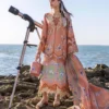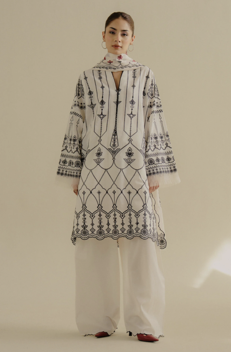 A crisp white lawn piece lifted with bold, playful embroidery in vibrant tones, finished with a cotton silk dupatta that adds a smooth, graceful layer to the look.