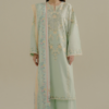 An intricate jacquard weave in Pastel Green, delicate hand-embroidery, and an airy chiffon dupatta combine to create a serene, textured ensemble.