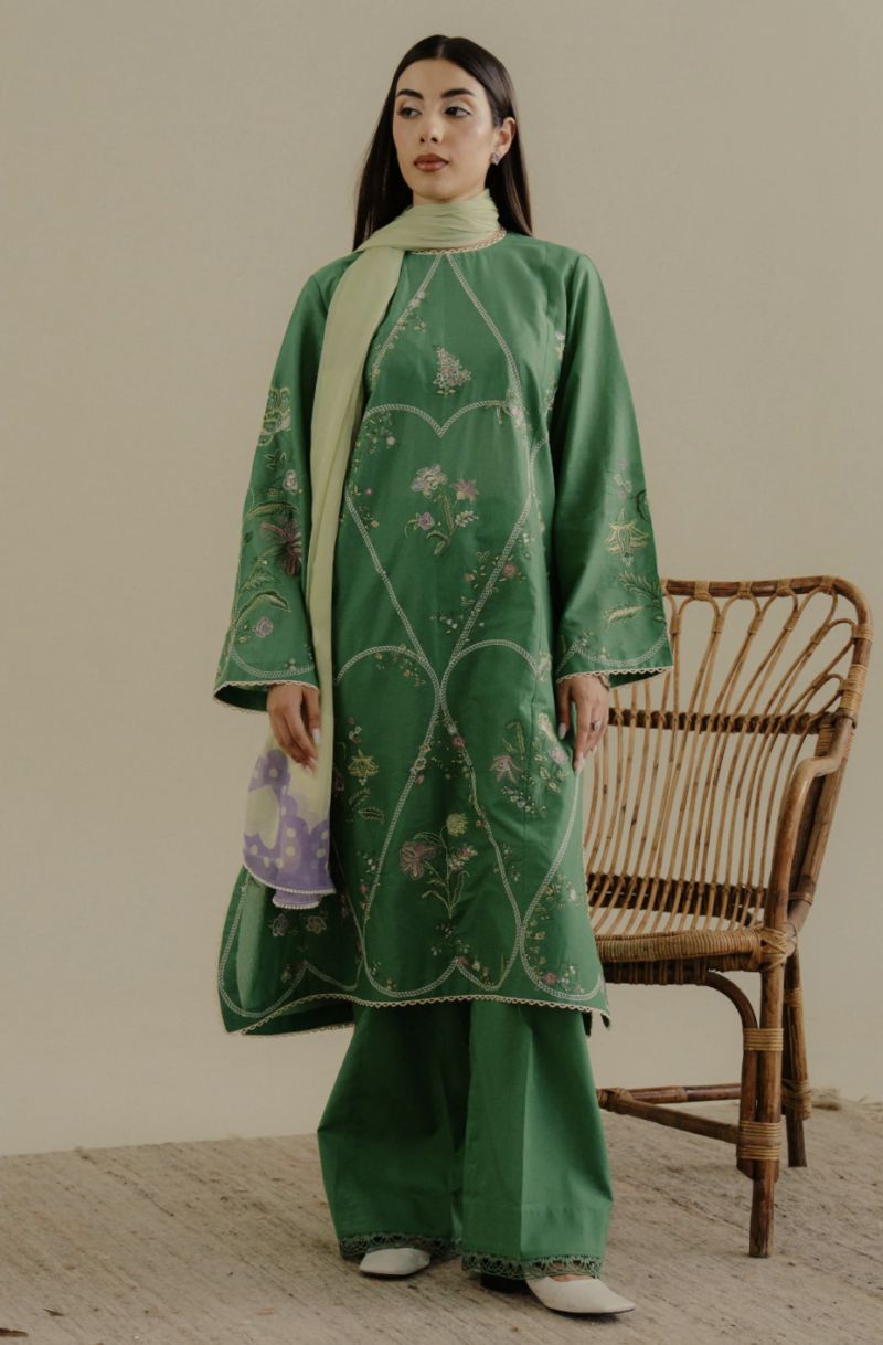 The fresh green Lawn, accented with pink detailing, is beautifully complemented by a delicate chiffon dupatta for a vibrant, airy look.