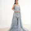 Radiating grandeur, Leyan makes a sublime statement. Rendered on dusty pink net, the shirt and lehenga set is lavishly adorned with intricately patterned embroideries, adding a touch of finesse. The ensemble is further elevated with a diaphanous net dupatta that creates an effortlessly graceful profile, evoking modern femininity with a whisper of timeless charm.