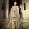 Evoking the femininity of a sweeping silhouette, Miyah is a breath of fresh air. Fashioned from dainty net fabric in an ombré ice blue hue, the majestic pishwas showcases a myriad of heritage crafts such as resham and tilla, arranged with great attention to detail in a meticulous linear pattern. Paired with a silk churidaar and an embroidered organza dupatta, this piece is sure to make heads turn at every event.
