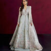 An enchanting, yet fierce wine shade of organza draped gracefully with a beautifully running pattern of small floral embellishments upfront, while floral vines of silver and monochromatic shades are etched into the apparel exquisitely. A ferocious look adorned in a serene and elegant vibe.